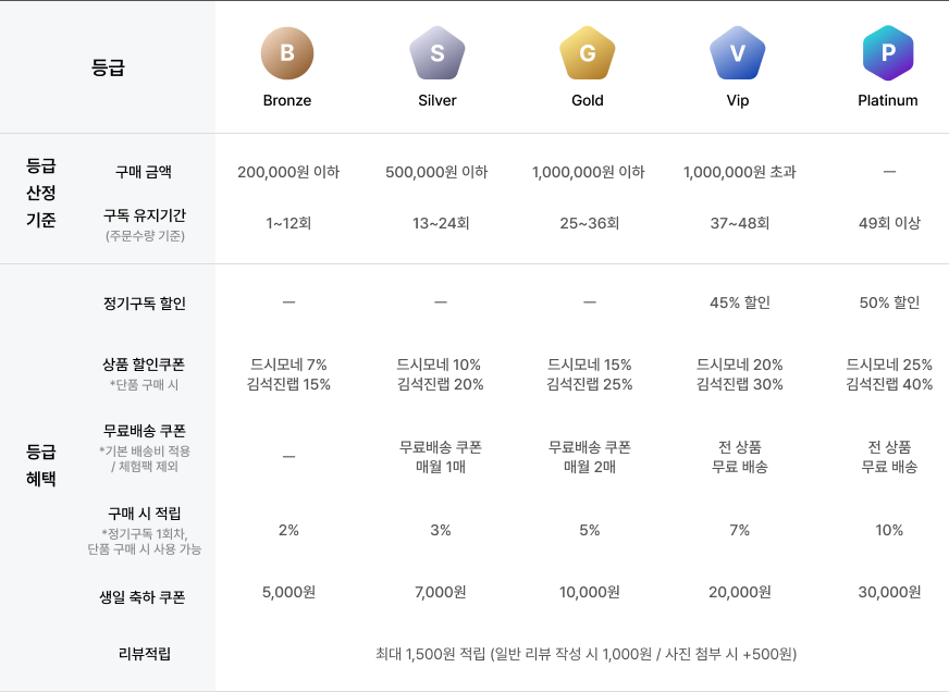 - 등급 월 직전 1년 구매 금액 or 구독 유지기간(주문수량 기준) 중 유리한 등급으로 산정: 직전 월 20일까지 (ex. 2025년 4월 등급 산정 시→ 실적 산정 기간: 2024.03.21~2025.03.20)