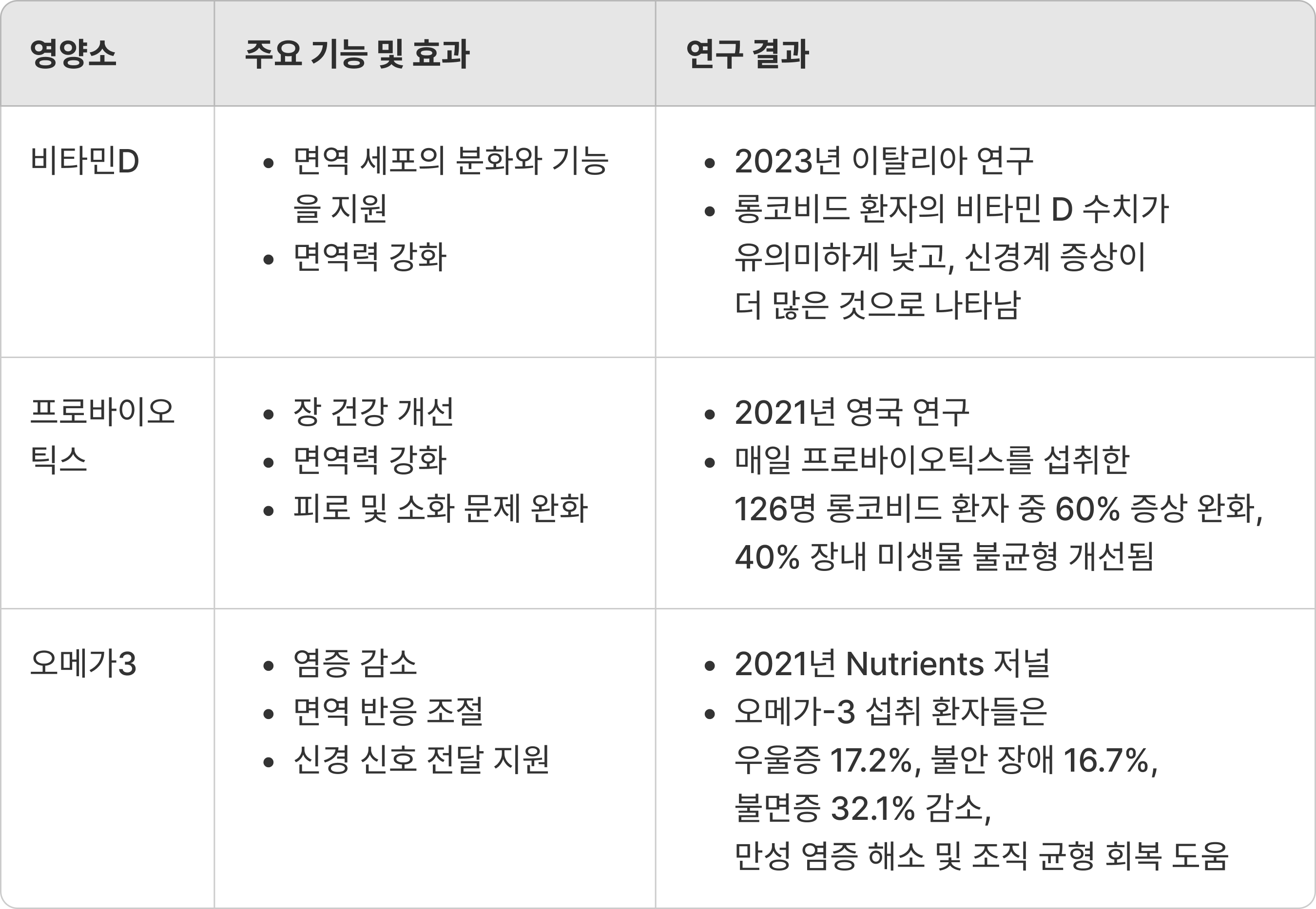 대표적으로 비타민 D, 비타민 C, 오메가3 지방산, 프로바이오틱스 등과 같은 영양소는 여러 연구를 통해 긍정적 기능이 밝혀지고 있고, 특히 롱코비드와 같은 장기적인 후유증 관리에 중요한 역할을 할 것으로 기대받고 있습니다.